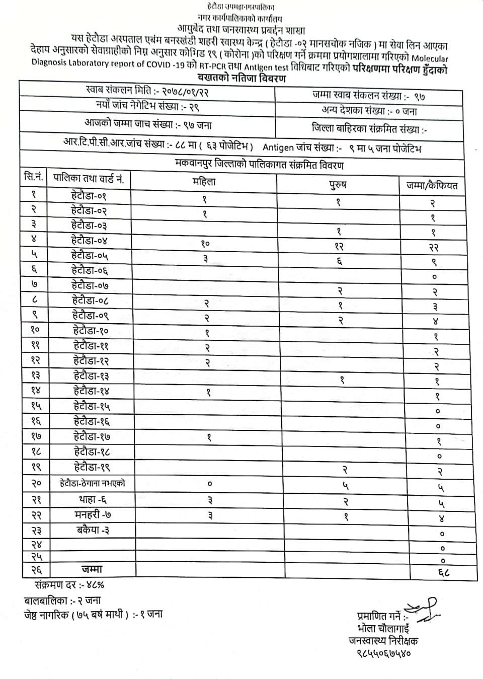 हेटौंडा– मकवानपुरमा आज थप ६८ जनामा कोरोना भाइरस संक्रमण पुष्टि भएको छ । हेटौंडामा गरिएको परिक्षणका क्रममा ६८ जनामा कोरोना संक्रमण पुष्टि भएको उपमहानगरपालिकाका जनस्वास्थ्य निरिक्षक भोला चौलागाईले वताउनुभयो । कोरोना पुष्टि हुनेमा हेटौंडा उपमहानगरपालिका ५९ जना, थाहा नगरपालिकाका ५ जना र मनहरी गाउँपालिकाका ४ जना रहेका छन् ।