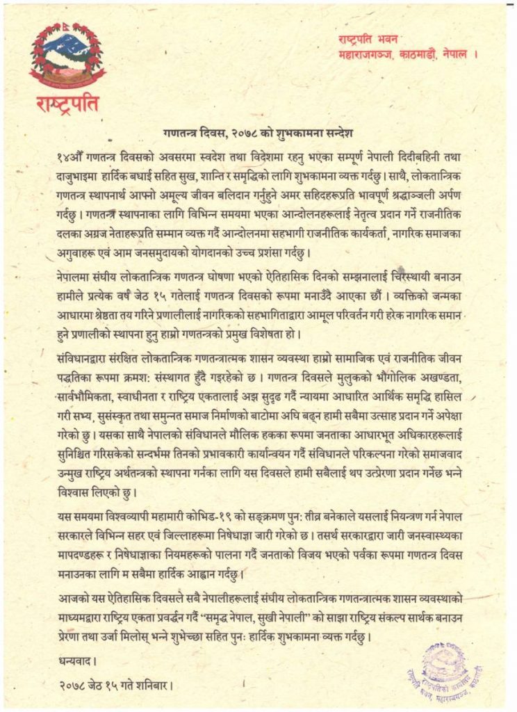 काठमाडौँ – राष्ट्रपति विद्यादेवी भण्डारीले संविधानले परिकल्पना गरेको समाजवादोन्मुख राष्ट्रिय अर्थतन्त्रको स्थापनाका लागि गणतन्त्र दिवसले सबैलाई थप उत्प्रेरणा प्रदान गर्ने विश्वास व्यक्त गर्नुभएको छ । चौधौँ गणतन्त्र दिवसका अवसरमा स्वदेश तथा विदेशमा रहेका नेपाली दिदीबहिनी तथा दाजुभाइमा बधाईसहित सुख, शान्ति र समृद्धिका लागि शुभकामना व्यक्त गर्दै राष्ट्रपति भण्डारीले संविधानले मौलिक हकका रूपमा जनताका आधारभूत अधिकारलाई सुनिश्चित गरिसकेका सन्दर्भमा तिनको प्रभावकारी कार्यान्वयन गर्दै विश्वव्यापी महामारी कोभिड–१९ को सङ्क्रमण पुनः तीव्र बनेकाले यसलाई नियन्त्रण गर्न नेपाल सरकारले विभिन्न सहर एवं जिल्लामा जारी गरेको निषेधाज्ञाका नियमको पालना गर्दै जनताको विजय भएको पर्वका रूपमा गणतन्त्र दिवस मनाउन आह्वान गर्नुभएको छ ।