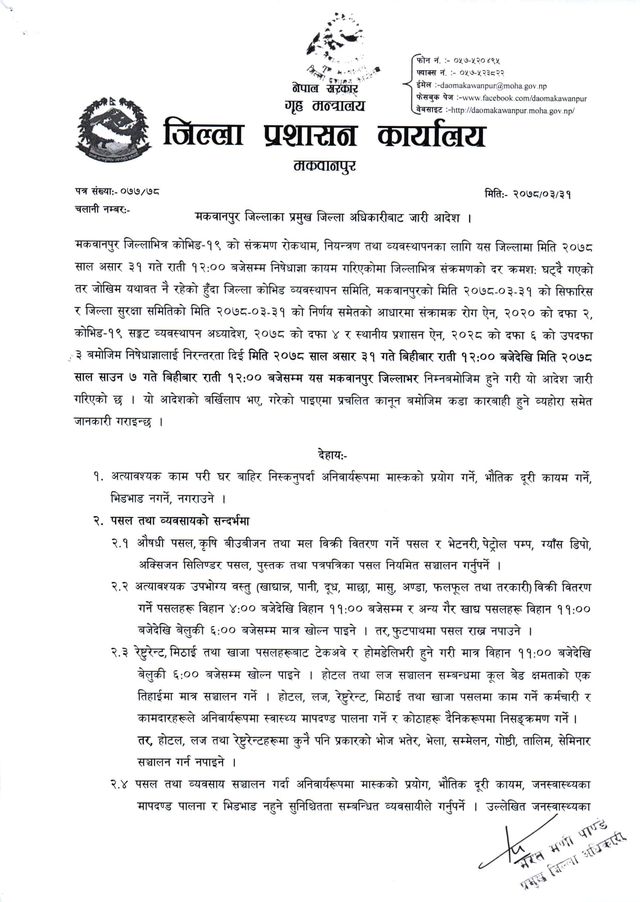 मकवानपुर – मकवानपुरमा जारी रहेको निषेधाज्ञा एक साता थपिएको छ । बिहीबार बसेको जिल्ला कोभिड व्यवस्थापन समितिको बैठकले जिल्लामा सक्रिय संक्रमितको संख्यामा कमि नआएकोले असार ३१ बिहिबार राति १२ बजेसम्म कायम गरिएको निषेधाज्ञा पुनः एक साता थप गर्दै साउन ७ गतेसम्म थप गरिएको हो ।