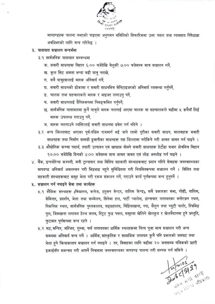 निषेधाज्ञा थप गरेपनि निषेधाज्ञाको स्वरुप भने परिवर्तन गरी बजार खोल्न समय थप गरिएको प्रमुख जिल्ला अधिकारी भरतमणि पाण्डेले बताउनुभयो । अब खाद्यान्न पसल विहान ११ बजे सम्म खोल्न पाईने छ , भने गैर खाद्यान्न पसल ११ बजे देखी साँझ ६ बजे सम्म खोल्न पाइने प्रजिअ पाण्डेले बताउनुभयो । सार्वजानिक सवारी साधनमा भने विहान ६ बजे देखी साँझ ७ बजे सम्म सञ्चालन गर्न पाइने तथा बाकीँ अन्य निर्णय भने पुरानै कायम रहने उहाँले बताउनुभयो ।