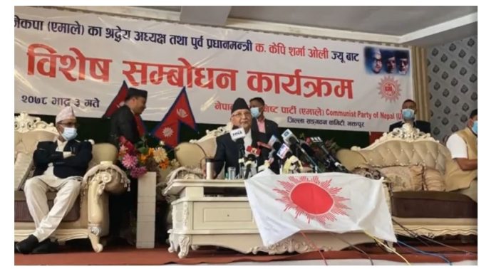 उहाँले भन्नुभयो, “यो देश बनाउने जिम्मा अहिले पनि एमालेकै काँधमा छ, त्यसैले पदको लोभमा त्यता बस्नु पर्दैन, माधव नेपालसँग नाम लेखेर निर्वाचन आयोगमा नाम दर्ता गराएका साथी नाम कटाएर पार्टीमा आउनुस्, कुनै पक्षपात नगरी पार्टीमा जिम्मेवारी दिन्छौँ, जिम्मेवारी सम्हाल्न्स् ।” अध्यक्ष ओलीले आफूहरु सत्तापक्षमै रहेको दाबी गर्दै भन्नुभयो, “प्रदेश र स्थानीय तहमा एमाले बहुमतमा छ, देशभरको सरकार हेर्दा एमाले सरकारमै रहेको प्रष्ट हुन्छ, प्रदेश र स्थानीय तहमा एमालेले बहुमतको सरकार चलाइरहेकाले एमाले प्रतिपक्ष मात्र नभएर अझै सत्तापक्षमै छ ।”
