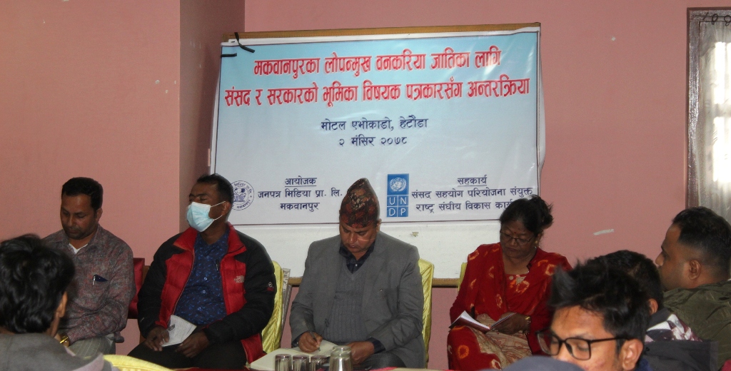हेटौंडा । मकवानपुरको मनहरी गाउँपालिका वडा नम्बर–४ मुसेधापमा वसोवास गर्दै आएका लोपन्मुख वनकरिया जातीका लागि संसद र सरकारको भूमिकाका विषयमा बिहीबार हेटौंडामा पत्रकारसंग अन्तरक्रिया कार्यक्रम भएको छ । जनपत्र मिडिया प्रालि मकवानपुरको आयोजना तथा संसद सहयोग परियोजना संयुक्त राष्ट्रसंघीय विकास कार्यक्रम (युएनडीपी) को आर्थिक सहयोगमा कार्यक्रम गरिएको हो ।