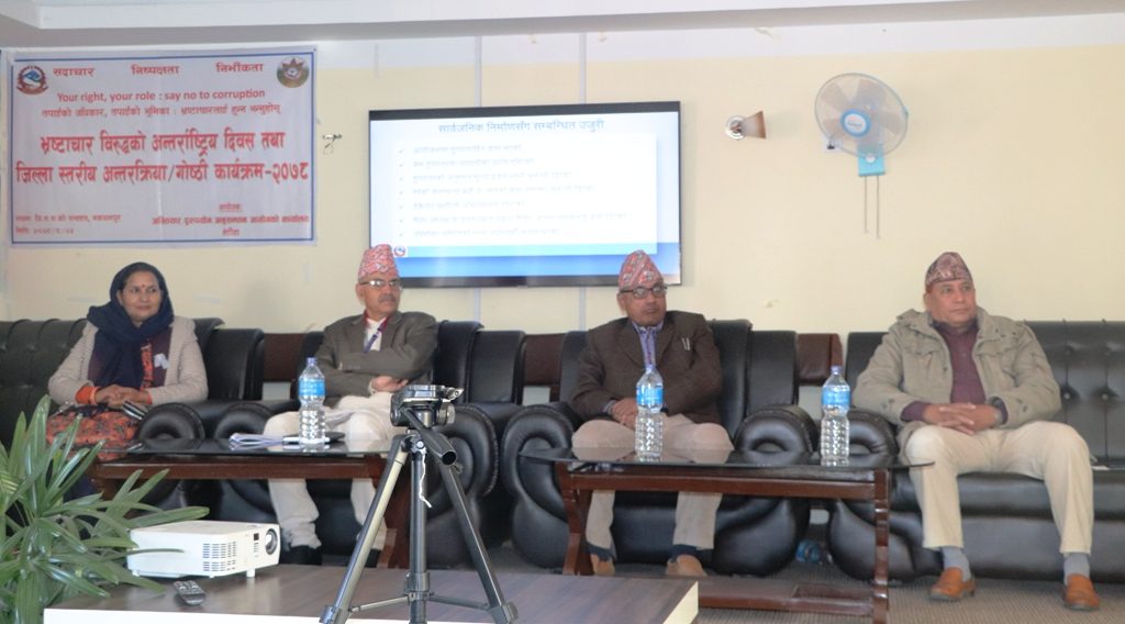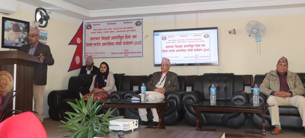 ‘हाम्रो अधिकार, हाम्रो भूमिकाः भ्रष्टाचार नगर्नु, नगराउनु’ भन्ने अन्र्तराष्ट्रिय नाराका साथ जिल्ला स्थित स्थानीय तहका प्रमुख उपप्रमुखहरुको सहभागितामा कायृक्रम भएको हो । कार्यक्रममा अख्तियार दुरुपयोग अनुसंधान आयोग हेटौंडाका प्रमुख अर्जुन कुमार शर्माले भ्रष्टाचार र अख्तियार दुरुपयोग अनुस्.धान आयोगको भुमिका विषयमा प्रस्तुति गर्नुभएको थियो । भने, उपसचिव विष्णु प्रसाद साकोटाले स्थानीय तहसंग सम्बन्धीत उजुरीको प्रवृति र सुशासन प्रवर्धनमा स्थानीय तहको भुमिका विषक प्रस्तुति गर्नु भएको थियो ।