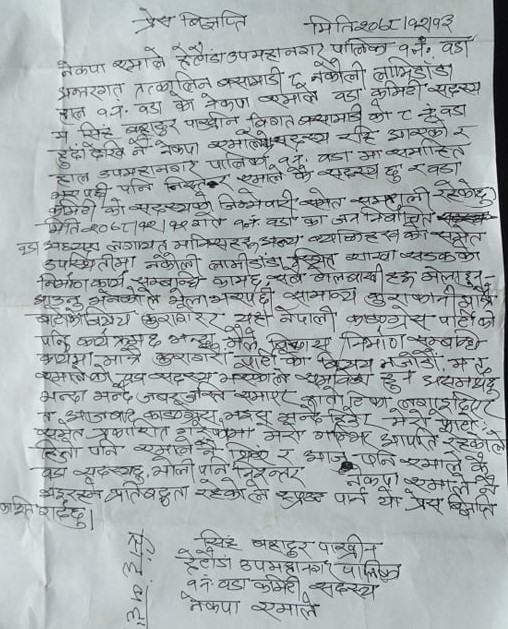चैत्र १२ गते सडक निर्माणको छलफल भनि बोलाएर सामुहिक फोटो खिचाउँदै पार्टी प्रवेश गराएको हल्ला फिजाएको भन्दै नेकपा एमाले हेटौँडा–१ का वडा सदस्य समेत रहेका सिंहबहादुर पाख्रिनले विज्ञप्ती जारी गरेका छन् । नेपाली कांग्रेसबाट विजयी भएका वडा नंबर १ का वडा अध्यक्ष समेतको सहभागितामा आफुलाई पार्टी प्रवेश गराएको भन्दै भ्रम फिजाएको भन्दै उनले आपत्ती जनाएका छन् । उनले विज्ञप्ती मार्फत आफु एमालेमानै रहेको उल्लेख गरेका छन् । म एमालेमानै प्रतिवद्ध छु भन्दाभन्दै जवरजस्ती समाएर टिका लगाउँदै तँ आजबाट कांग्रेस भैस भन्दै आयोजकहरु हिडेको उनले बताएका छन् ।