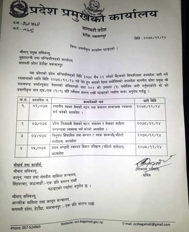 प्रदेश प्रमुखको कार्यालयका सचिव शिवराम न्यौपानेले जारी गरिएको अध्यादेशबारे सूचना प्रकाशित गरी सो सम्बन्धी जानकारी गराउनुभएको छ । प्रदेश प्रमुख शर्माले विवादित मदन भण्डारी स्वास्थ्य विज्ञान प्रतिष्ठान (पहिलो संशोधन) अध्यादेशसहित स्थानीय तहका सेवाको गठन तथा सञ्चालन सम्बन्धमा व्यवस्था गर्न बनेको अध्यादेश, प्रदेश निजामती सेवाको गठन, सञ्चालन र सेवाका शर्तहरु सम्बन्धमा व्यवस्था गर्न बनेको अध्यादेश, विभूषण सिफारिस तथा सम्मान र पदकसम्बन्धी (पहिलो संशोधन) अध्यादेश प्रमाणित गर्नुभएको हो । जारी अध्यादेशलाई प्रदेश सभाको आगामी बैठक सुरु भएको ६० दिन भित्र प्रतिस्थापन विधेयक पेश गरी प्रदेश सभा बैठकबाट पारित गर्नुपर्नेछ ।
