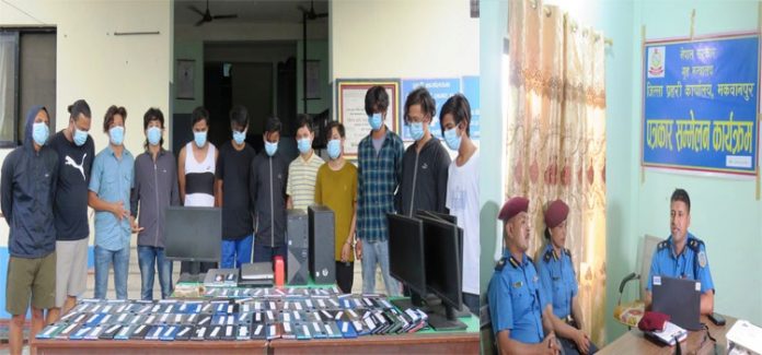 मकवानपुर – मकवानपुर प्रहरीले हेटौंडामा अनलाइन जुवा खेल्ने १२ जनालाई पक्राउ गरेको छ । प्रहरीले बिशेष सूचनाको आधारमा हेटौं–४ कमलडाँडा स्थित रुकमणी न्यौपानेको घरबाट ईलोक्ट्रोनिक्स सामान, नगदसहित अनलाईन जुवा खेल्ने १२ जनालाई पक्राउ गरेको हो ।
