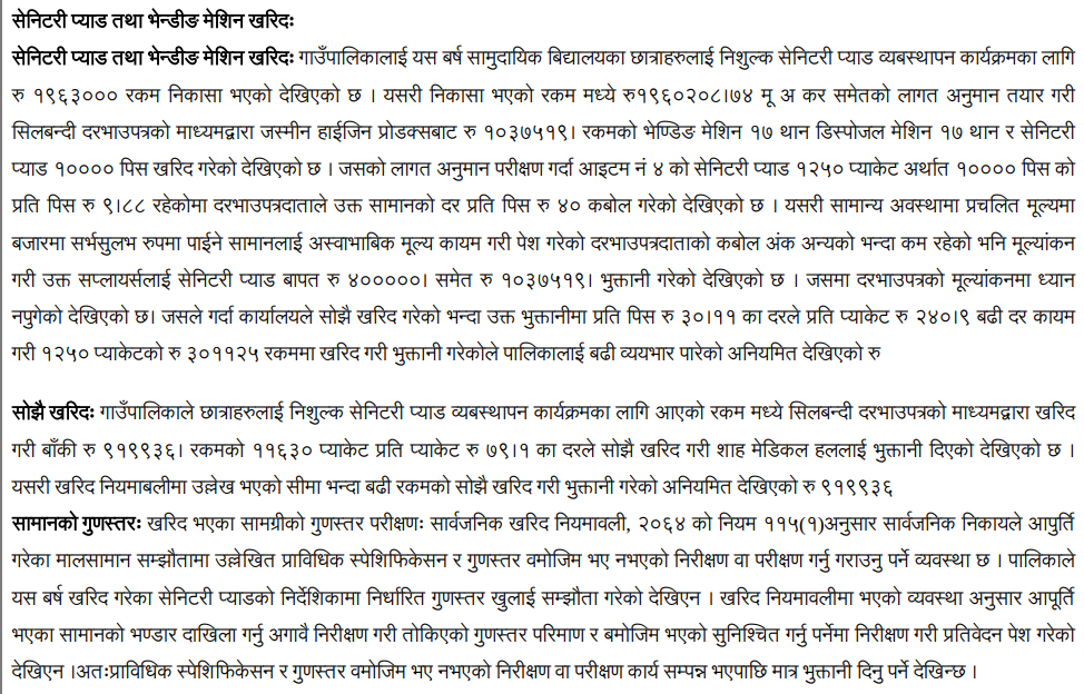 बकैयाँ गाउँपालिकाले बोलपत्र मार्फत खरिद गरेको सेनिटरी प्याड र सोझै खरिद गरेको सेनिटरी प्याड खरिदमा बढी रकम भुक्तानी गरेको महालेखा परिक्षकको कार्यालयले जनाएको छ । बकैयाँका बिद्यालयमा अध्यनरत किशोरी बिद्यार्थी महिनावारी हुँदा प्रयोग गर्ने सेनिटरी प्याड खरिदमा पनि प्रतिप्याकेट २४० रुपैयाँ बढी रकम गाउँपालिकाले भुक्तानी गरेको जनाएको छ । सर्ब सुलभ रुपमा प्राप्त गर्ने सेनिटरी प्याड गाउँपालिकाले सोझै पहिले खरिद गर्दा प्रतिपिस १० रुपैयाँमा खरिद गरेकोमा दरभाउ कर्ताले प्रतिपिस ४० रुपैयाँ कबोल गरेकोमा त्यही सामान खरिद गरेकोमा महालेखाले प्रश्न उठाएको हो ।