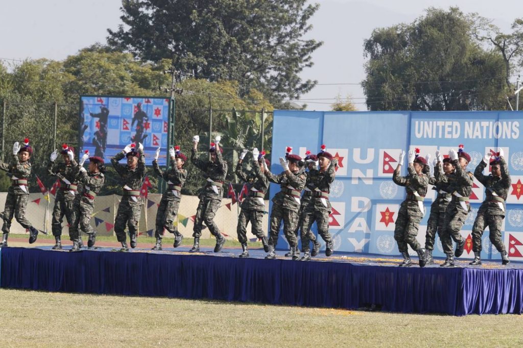 सेनाले सैनिक मुख्यालय जङ्गी अड्डामा रहेको खेल मैदानमा अन्य सुरक्षा फौजको समेत सहभागितामा मार्च–पास्ट, झाँकी, जुम्बा र व्याण्ड प्रदर्शन गर्याे । त्यस अवसरमा काठमाण्डौ उपत्यकाभित्रका सैनिक आवासीय महाविद्यालय/विद्यालय र राष्ट्रिय सेवा दलका शिक्षार्थीद्वारा नृत्यसमेत प्रस्तुत गरियो । प्रधानसेनापति प्रभुराम शर्माले विभिन्न खेलकुद प्रतियोगिताका विजयीलाई पुरस्कार प्रदान गर्नुभएको सैनिक जनसम्पर्क तथा सूचना निर्देशनालयले जनाएको छ । पाँच किलोमिटर वाकाथन र तीन हजार दुई सय मिटर साइकल दौड प्रतियोगितासमेत सञ्चालन गरिएको थियो । ‘युएन डे’ का अवसरमा सेनाले भोलि सैनिक मुख्यालयमा ‘संयुक्त राष्ट्रसङ्घीय शान्ति स्थापना कार्य तथा भावी सवल जिम्मेवारी’ विषयमा अन्तर्राष्ट्रिय कार्यशाला गर्दैछ ।
