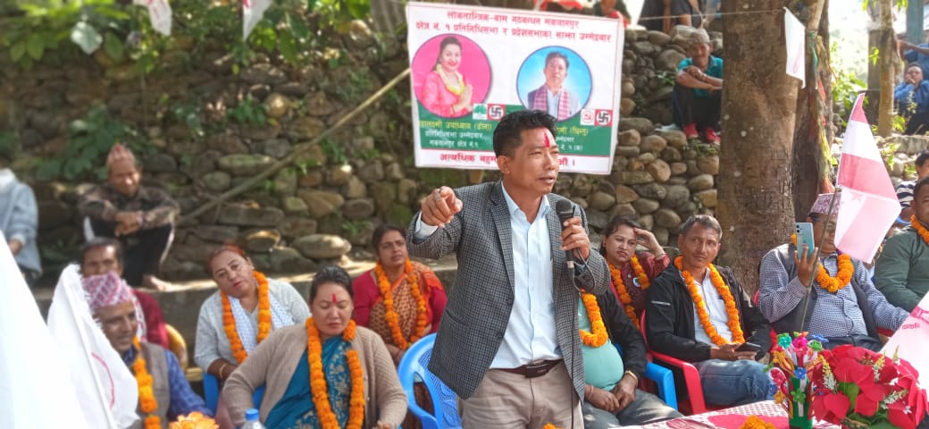 उम्मेदवार छिन्तुले मुलुकको विकास र समृद्धि गर्ने जिम्मेवारी लोकतान्त्रिक बाम गठबन्धनकै भएकाले भ्रममा नपरी गठबन्धनको चुनाव चिन्ह रुख र गोलाकारभित्रको हँसिया हथौडामा मतदान गर्न मतदातालाई आग्रह गर्नुभयो । अहिले विभिन्न प्रलोभन देखाएर जनताको अधिकार लुट्न प्रतिगामीहरु सल्बलाएको भन्दै उहाँले यस्ता प्रतिगामीहरुलाई बेलैमा चिनेर परास्त गर्नुपर्ने बताउनुभयो ।