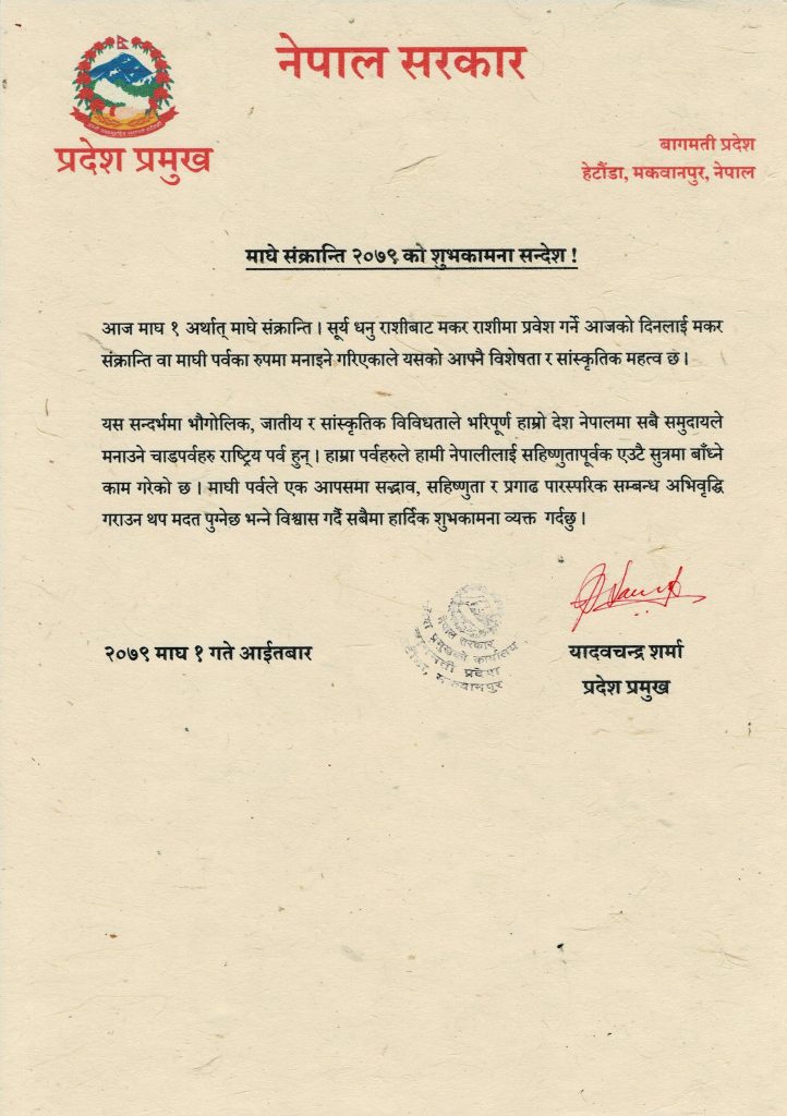 मकवानपुर । आइतबार माघ १ मा मनाइँदै गरिएको माघे संक्रान्तिका अवसरमा बागमती प्रदेशका प्रदेश प्रमुख यादवचन्द्र शर्माले शुभकामना व्यक्त गर्नुभएको छ । प्रदेश प्रमुख शर्माले प्रेस विज्ञप्ती गर्नुहुँदै सूर्य धनु राशीबाट मकर राशीमा प्रवेश गर्ने दिनलाई मकर संक्रान्ति वा माघी पर्वका रुपमा मनाइने गरिएकाले यसको आफ्नै विशेषता र सांस्कृतिक महत्व रहेको उल्लेख गर्नुभएको छ। नेपालमा मनाइँने सबै पर्व राष्ट्रिय पर्व भएको उल्लेख गर्नुहुँदै शर्माले यस्ता पर्वले नेपालीहरुलाई एउटै सुत्रमा बाँध्ने काम गरेको बताउनुभएको छ।‘भौगोलिक, जातीय र सांस्कृतिक विविधताले भरिपूर्ण हाम्रो देश नेपालमा सबै समुदायले मनाउने चाडपर्वहरु राष्ट्रिय पर्व हुन्।’प्रमुखको शुभकामना सन्देशमा भनिएको छ,‘हाम्रा पर्वहरुले हामी नेपालीलाई सहिष्णुतापूर्वक एउटै सुत्रमा बाँध्ने काम गरेको छ।’ माघी पर्वले एक आपसमा सद्भाव,सहिष्णुता र प्रगाढ पारस्परिक सम्बन्ध अभिवृद्धि गराउन थप मदत पुग्नेछ भन्ने विश्वास पनि प्रमुख शर्माले गर्नुभएको छ ।