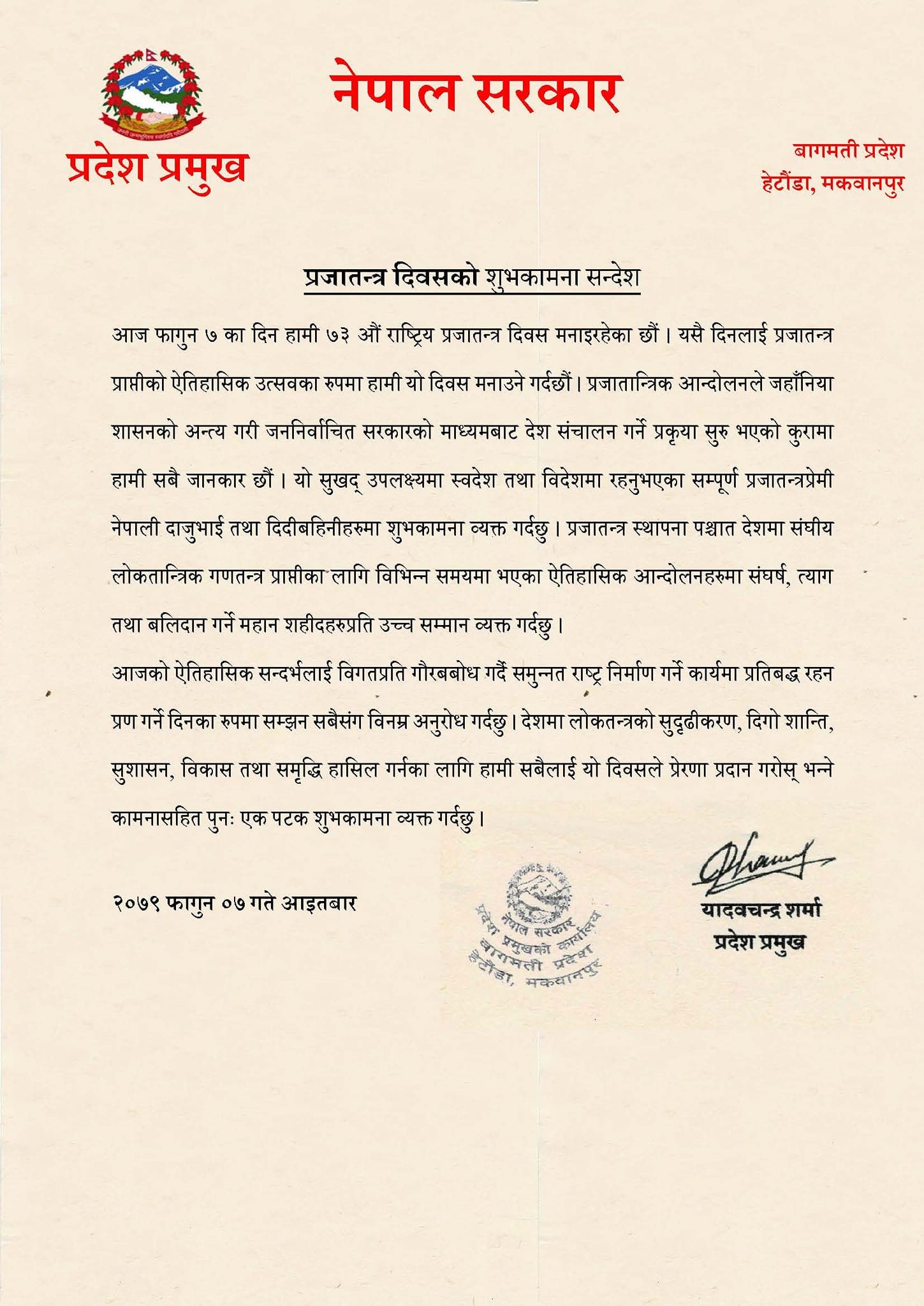 हेटौंडा । बागमती प्रदेश प्रमुख यादवचन्द्र शर्माले लोकतन्त्रको सुदृढीकरण, दिगो शान्ति, सुशासन, विकास तथा समृद्धि हासिल गर्नका लागि सबैलाई राष्ट्रिय प्रजातन्त्र दिवसले प्रेरणा प्रदान गरोस् भन्ने कामना गरेका छन् । ७३औं राष्ट्रिय प्रजातन्त्र दिवसका अवसरमा आज एक सन्देश जारी गर्दै उनले प्रजातन्त्र स्थापनापश्चात् देशमा सङ्घीय लोकतान्त्रिक गणतन्त्र प्राप्तिका लागि विभिन्न समयमा भएका ऐतिहासिक आन्दोलनमा सङ्घर्ष, त्याग तथा बलिदान गर्ने सहिदहरूप्रति उच्च सम्मान अर्पण गरेका छन् । उनले सन्देशमा आजको ऐतिहासिक सन्दर्भलाई विगतप्रति गौरबवोध गर्दै समुन्नत राष्ट्र निर्माण गर्ने कार्यमा प्रतिबद्ध रहन प्रण गर्ने दिनका रूपमा सम्झन सबैलाई अनुरोध गरेका छन् ।