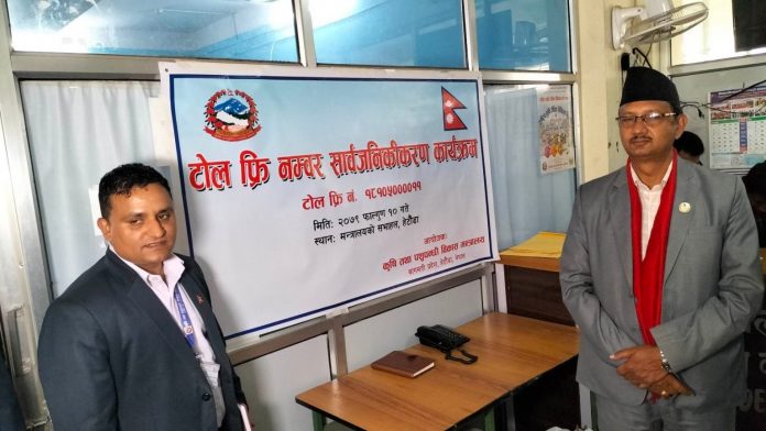 हेटौँडा । बागमती प्रदेशको कृषि मन्त्रालयमा टोलफ्रि नम्बरको सुरुवात गरिएको छ । टोलफ्रि नम्बरको उद्घाटन् आज प्रदेशका कृषि तथा पशुपन्छी विकास मन्त्री केशब प्रसाद पोख्रेलले गर्नुभएको हो । अब प्रदेशभरीका किसानहरुले आफ्ना समस्या मन्त्रालयमा सिधै पैसा नलाग्ने नम्बरमा फोन गरेर टिपाउन सक्नेछन् ।