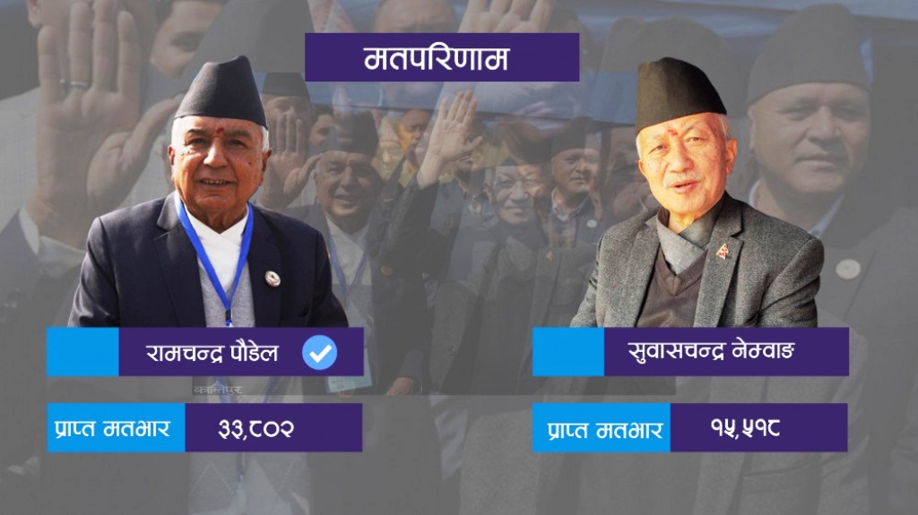 राष्ट्रपतिको निर्वाचनको मतगणना सकिएको छ । निर्वाचनको मतपरिणामअनुसार राष्ट्रपतिमा रामचन्द्र पौडेल विजयी हुनुभएको छ ।