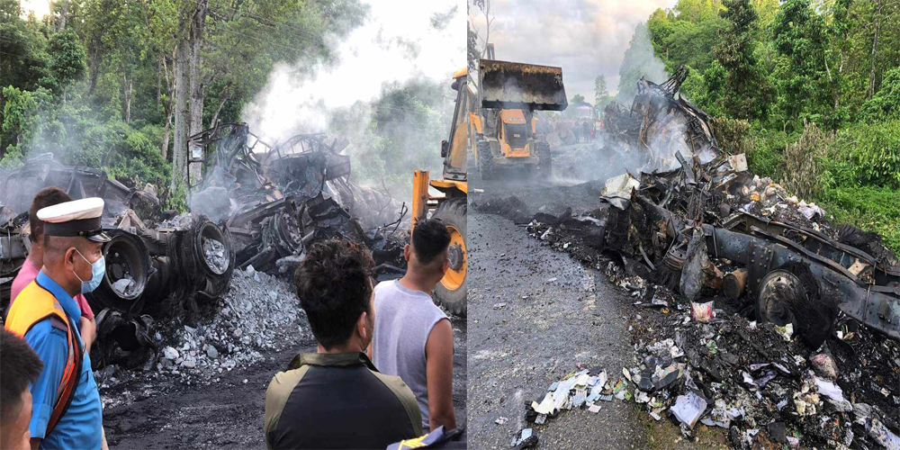 पुर्ब पश्चिम सडक खण्डमा हेटौडाबाट चितवनतर्फ जादै गरेको ना ६ ख ६६६७ नम्बरको ट्रक र बिपरीत दिशा तर्फबाट आउदै गरेको ना ६ ख ६३१ नम्बरको ट्रक मकवानपुरको मनहरी गाउँपालिका–६, स्थित नयाबस्ती डिपाट गाउँमा एक आपसमा ठक्कर खाई दुर्घटना हुदा दुबै ट्रकमा आगलागी भएको प्रहरीले जनाएको छ । दुर्घटना ज्यान गुमाउनेमा ना ६ ख ६६६७ नम्बरको ट्रकका चालक चितवनको राप्ति नगरपालिका–८ का २८ वर्षीय रिहान रुम्बा तामाङ, सोहि ट्रकका सहचालक गोरखाको गण्डकी गाउँपालिका–२ गोर्दीटारका २१ वर्षीय सुमन चेपाङ र ना ६ ख ६३१ नम्बरको ट्रकका सहचालक मनहरी गाउँपालिका–३ का २० वर्षीय अमृत प्रजा रहेको जिल्ला प्रहरी कार्यालय मकवानपुरका प्रहरी नायब उपरीक्षक कार्कीले जानकारी दिनुभयो ।