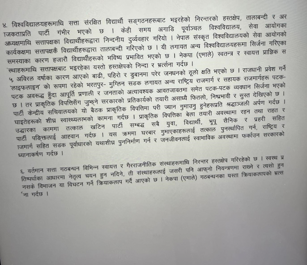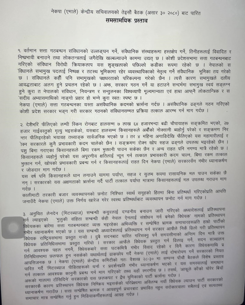 प्रमुख प्रतिपक्ष दल नेकपा (एमाले)को सचिवालय बैठकबाट विभिन्न ६ वटा प्रस्ताव पारित गरिएको छ । शनिबार पार्टी केन्द्रीय कार्यालय च्यासलमा बसेको बैठकबाट समसामयिक प्रस्ताव पारित गरिएको उपमहासचिव प्रदीप ज्ञवालीले जानकारी दिनुभयाे । पारित प्रस्तावमा कोसी प्रदेश सरकार भंंग गरी नयाँ निर्माण प्रक्रिया अपनाउन माग गरिएको छ । यस्तै, किसानलाई मल उपलब्ध गराउन माग गरिएको छ । मिटरब्याजसम्बन्धी विधेयक तत्काल संसद्मा ल्याउनलगायत माग गरिएको छ ।