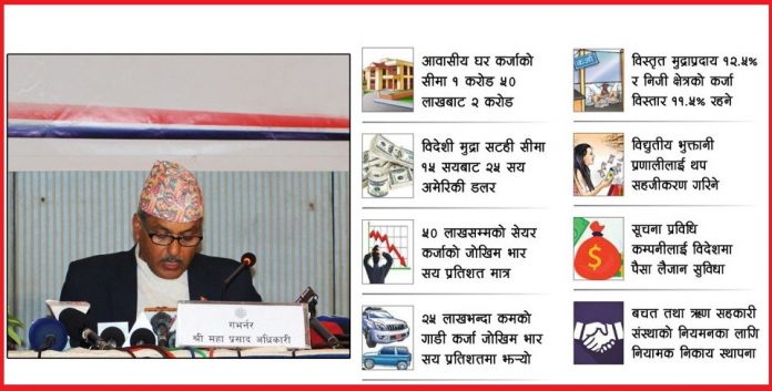 तर, आवासीय घर कर्जाको सीमा वृद्धि, ५० लाखभन्दा साना सेयर कर्जा, २५ लाखभन्दा साना हायर पर्चेज कर्जा र सूचीकृत घरजग्गा व्यवसायीबाट भएका घरजग्गा कर्जामा जोखिम भार घटाएर बजारको माग केही सम्बोधन गर्न खोजिएको छ ।