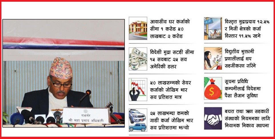 ठूला कर्जालाई नियमन गर्ने, वास्तविक समस्यामा रहेका ऋणीलाई सुविधाका लागि नीति बनाउने, निक्षेपकर्ताको हित संरक्षण गर्ने व्यवस्था समेटिए पनि कर्जा विस्तारको सीमा गत वर्षको भन्दा घटाइएको छ । यी व्यवस्थाले सुस्त रहेको कर्जाका माग नबढ्ने भएकाले अर्थतन्त्रको विद्यमान समस्या सम्बोधन नगर्ने सरोकारवाला बताउँछन् ।