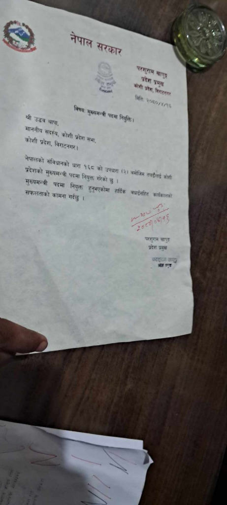 त्यसअघि अपराह्न ४ बजेर ४५ मिनेटमा थापाले मुख्यमन्त्रीमा नियुक्त गर्न प्रदेश प्रमुख समक्ष दाबी पेश गर्नुभएको थियो । कोशी प्रदेश सभामा ९३ सदस्य रहेका छन् । जसमध्ये नेपाली कांग्रेसका २९, नेकपा माओवादी केन्द्रका १३, एकीकृत समाजवादीका ४ र जनता समाजवादी पार्टीका १ गरी ४७ जना प्रदेशसभा सदस्यको समर्थनमा थापा मुख्यमन्त्रीमा नियुक्त हुनुभएको हो । एक हप्ता अघि अदालतको निर्णयपछि थापाको मुख्यमन्त्री पद खारेज भएको थियो ।