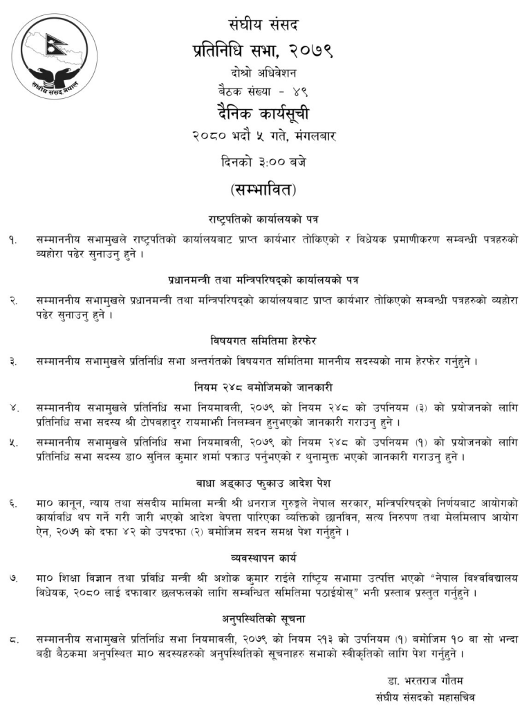 यस्तै, प्रधानमन्त्री तथा मन्त्रिपरिषद्को कार्यालयबाट प्राप्त कार्यभार तोकिएकोसम्बन्धी पत्र तथा विषयगत समितिमा सदस्य हेरफेरबारे जानकारी गराउनेलगायत कार्यसूचीसमेत रहेको संसद् सचिवालयले जनाएको छ ।
