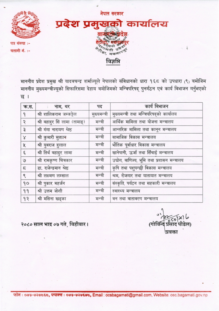 बागमती प्रदेश सरकारमा बहादुरसिं लामालाई आर्थिक मामिला तथा योजना मन्त्रालय, गङ्गानारायण श्रेष्ठलाई आन्तरिक मामिला तथा कानून मन्त्रालय, कुमारी मोक्तानलाई सामाजिक विकास मन्त्रालय, युवराज दुलाललाई भौतिक पूर्वाधार विकास मन्त्रालय, तीर्थबहादुर लामालाई खानेपानी, ऊर्जा तथा सिँचाइ मन्त्रालयको जिम्मेवारी प्रदान गरिएको छ ।