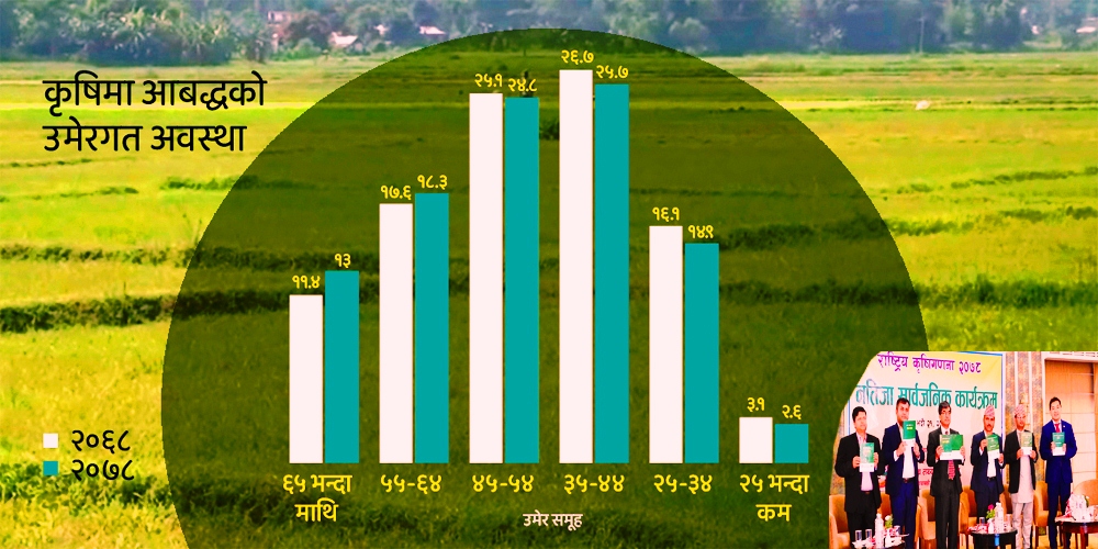 राष्ट्रिय तथ्याङ्क कार्यालयले १० वर्षको अन्तरमा गणना हुने कृषि गणानाको नतिजा सार्वजनिक गर्दा यस्तो अवस्था देखिएको हो । २०७८ को विवरण बिहीबार सार्वजनिक गरिएको हो । सार्वजनिक नतिजा प्रतिवेदनअनुसार कुल कृषिमा आवद्ध हुने नेपालीमध्ये ५५ वर्ष उमेरदेखि ६४ उमेर समूह २०६८ सालमा १७ दशमलव ६ प्रतिशत कृषिमा थिए । तर अहिले त्यो संख्या बढेर १८ दशमलव ३ प्रतिशत पुगेको छ ।