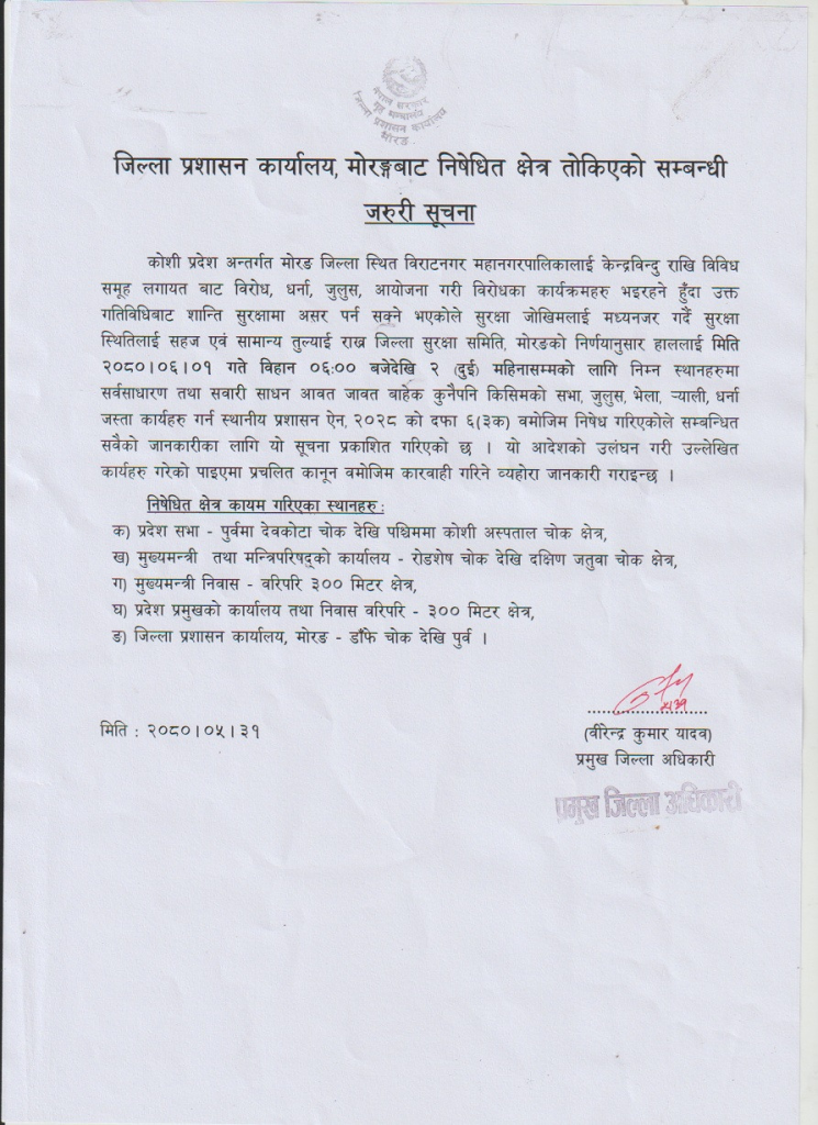 जिल्ला प्रशासन कार्यालय मोरङले विराटनगरमा दुई महिनाका लागि निषेधित क्षेत्र घोषणा गरेको छ । प्रमुख जिल्ला अधिकारी वीरेन्द्रकुमार यादवले जरुरी सूचना निकालेर भोलि साेमवार बिहान ६ बजेदेखि सर्वसाधारण तथा गाडी आवातजावातबाहेक सभा, जुलुस, भेला, र्याली, धर्नालगायतका गतिविधि गर्न रोक लगाएको जानकारी गराउनुभएको हो ।
