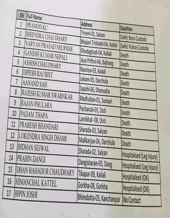 गएको भदौ १८ र १९ गते प्रयोगात्मक सिकाइका लागि इजरायल पुगेका उनीहरू सुदूरपश्चिम विश्वविद्यालयको कृषि सङ्कायका आठौँ सेमेस्टरका विद्यार्थी हुन् । ज्यान गुमाउनेहरूमा नारायणप्रसाद न्यौपाने घोडाघोडी–०४ कैलाली, गणेशकुमार नेपाली जयपृथ्वी–०६ बझाङ, आशिष चौधरी बौनिया–०३ कैलाली, दिपेशराज विष्ट लेकम–०५ दार्चुला, आनन्द साह सपही–०६ धनुषा, राजेशकुमार स्वर्णकार मधुवन–०१ सुनसरी, राजन फुलरा पाचनली–०३ डोटी, पदम थापा लमिखल–०८ डोटी, प्रवेश भण्डारी शारदा–०३ सल्यान, लोकेन्द्रसिंह धामी मालिकार्जुन–०४ दार्चुला रहेका छन् ।सल्यानका विधान सेजवाल, दाङका प्रविन डाँगी, कैलालीका धनबहादुर चौधरी र गोरखाका हिमाञ्चल कट्टेलको उपचार भइरहेको छ । कञ्चनपुरका विपिन जोशी बेपत्ता छन् । सल्यानका प्रमोद केसी र कैलालीका वीरेन्द्र चौधरी सुरक्षित रहेका दूतावासले जनाएको छ ।