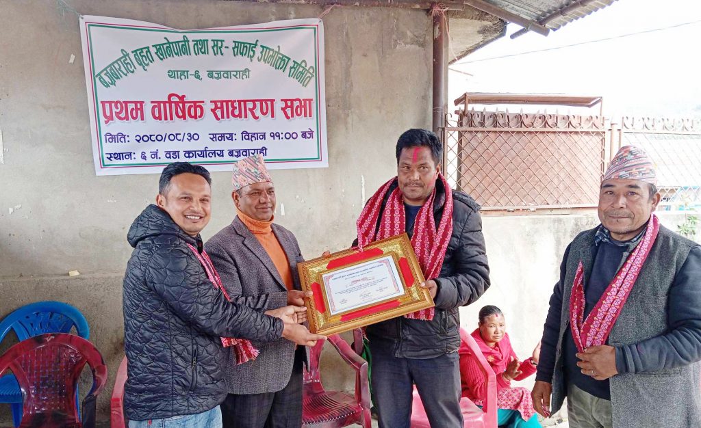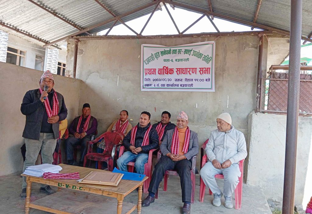 बज्रवाराही वृहत खानेपानी तथा सरसफाई आयोजनाका अध्यक्ष चित्र बहादुर बलामीको अध्यक्षतामा भएको कार्यक्रम सचिव सुविनभक्त श्रेष्ठले सञ्चालन गरेका थिए । सभाले अध्यक्ष बलामीको प्रगती प्रतिवेदन, कोषाध्यक्षको आम्दानी खर्चको प्रतिवेदन पास गरेको छ । सभाले पुनः चित्र बहादुर बलामीको अध्यक्षतामा नयाँ समिति सर्वसम्मत पुर्नगठन गरेको छ । समितिको सचिव सविन भक्त श्रेष्ठ, कोषाध्यक्ष जानकी श्रेष्ठ, सदस्यहरु सुर्य बहादुर श्रेष्ठ, भरत गोपाली, रमिता बलामी, सुभद्रा महर्जन, नकुल बलामी, सोनु श्रेष्ठलगायत चयन भएका छन् । कार्यक्रममा समिति अन्तर्गतका कर्मचारीहरु तथा उपभोक्ताहरुको उपस्थिती रहेको थियो ।
