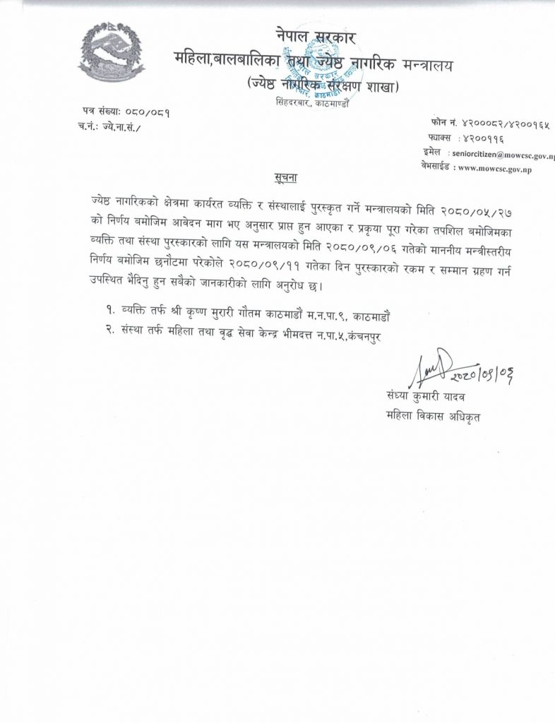 मन्त्रालयले यसवर्ष जेष्ठ नागरिकका पक्षमा उल्लेखनीय कार्य गरेको भन्दै व्यक्तितर्फ नेपाली साहित्यमा चट्याङ मास्टरका नामले सुविख्यात कृष्ण मुरारी गौतम,काठमाडौँलाई ज्येष्ठ नागरिक वर्ष पुरुष घोषणा गरी नगद एक लाखसहित सम्मान गर्दैछ भने संस्थातर्फ यो वर्ष महिला तथा वृद्ध सेवा केन्द्र, कञ्चनपुरलाई सम्मान गर्ने जनाएको छ ।