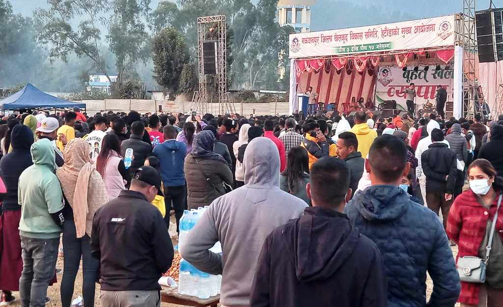 हेटौंडा । हेटौंडाको टिसिएन चौरमा जारी बृहत् खेलकुद तथा व्यापार महोत्सवमा राष्ट्रिय कलाकारको प्रश्तुतीमा दर्शकको भीड लागेको छ । महोत्सवमा दैनिक राष्ट्रिय तथा स्थानीय कलाकारको सांगीतिक प्रश्तुती भैरहेको छ । अन्य दिनको तुलनामा ल्होछारको दिन आइतबार महोत्सवमा सर्वसाधारणको भीड लागेको थियो । महोत्सवमै भैरहेको राष्ट्रिय महिला भलिबल प्रतियोगितामा दर्शकको घुइँचो थियो ।