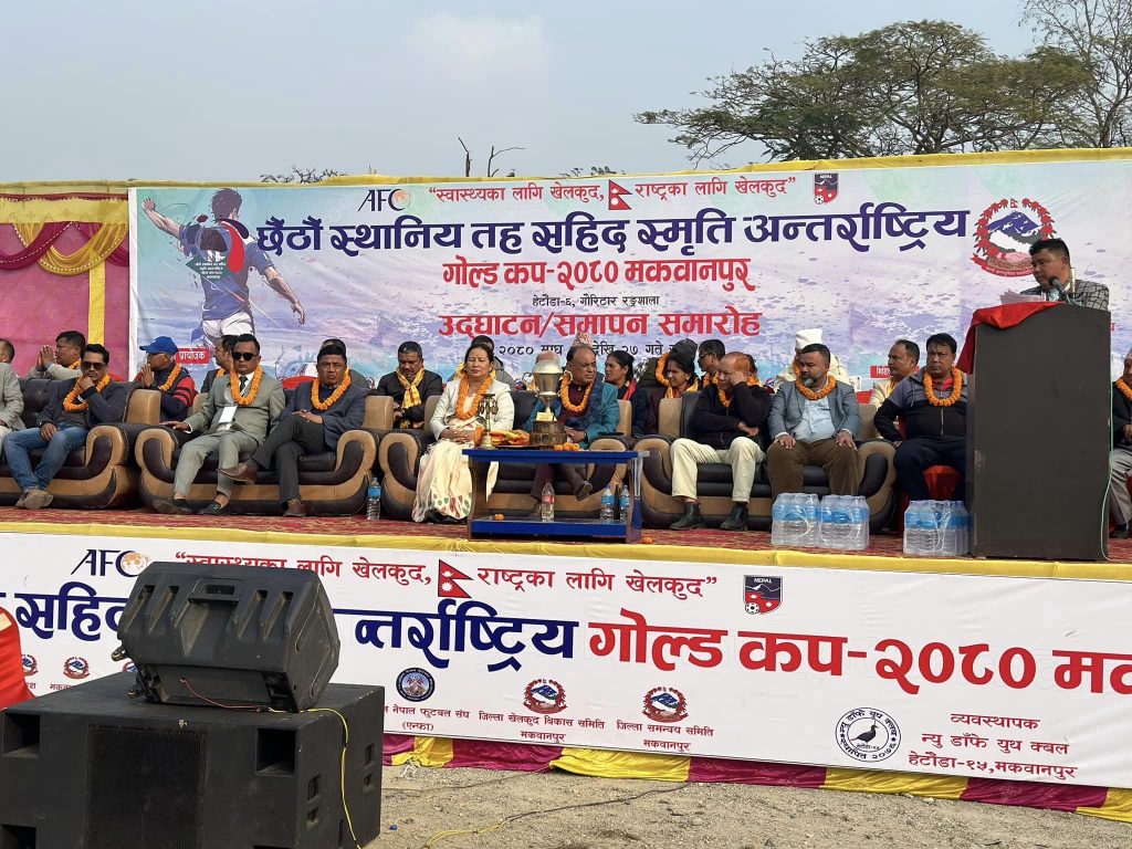 मकवानपुर । मकवानपुर जिल्ला फुटबल संघको आयोजनामा आजबाट हेटौंडामा सहिद स्मृति स्थानीय तह अन्तर्राष्ट्रिय मकवानपुर गोल्डकप फुटबल प्रतियोगिता सुरु भएको छ । हेटौंडा–६ स्थित गौरीटार बहुउदेश्यीय रंगशालामा सुरु भएको गोल्डकपमा बागमती युवा क्लब सर्लाहीले विजयी यात्र सुरु गरेको छ ।
