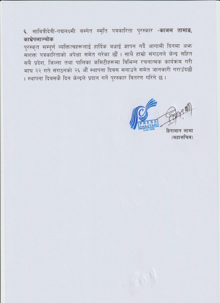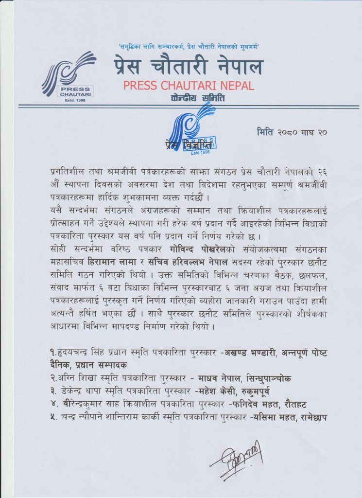 त्यस्तै, अग्निशिखा स्मृति पत्रकारिता पुरस्कार सिन्धुपाल्चोकका माधव नेपाल, डेकेन्द्र थापा स्मृति पत्रकारिता पुरस्कार रुकुमपूर्वका महेश केसीलाई प्रदान गरिने भएको छ । चौतारीले वीरेन्द्रकुमार साह क्रियाशील पत्रकारिता पुरस्कार रौतहटका फनिदेव महत, सावित्रीदेवी–पद्मलक्ष्मी बस्नेत स्मृति पत्रकारिता पुरस्कार काभ्रेपलाञ्चोकी काजल तामाङ, चन्द्र न्यौपाने शान्तिराम कार्की स्मृति पत्रकारिता पुरस्कार रामेछापकी यासिमा महतलाई प्रदान गरिने प्रेस चौतारीले जनाएको छ ।