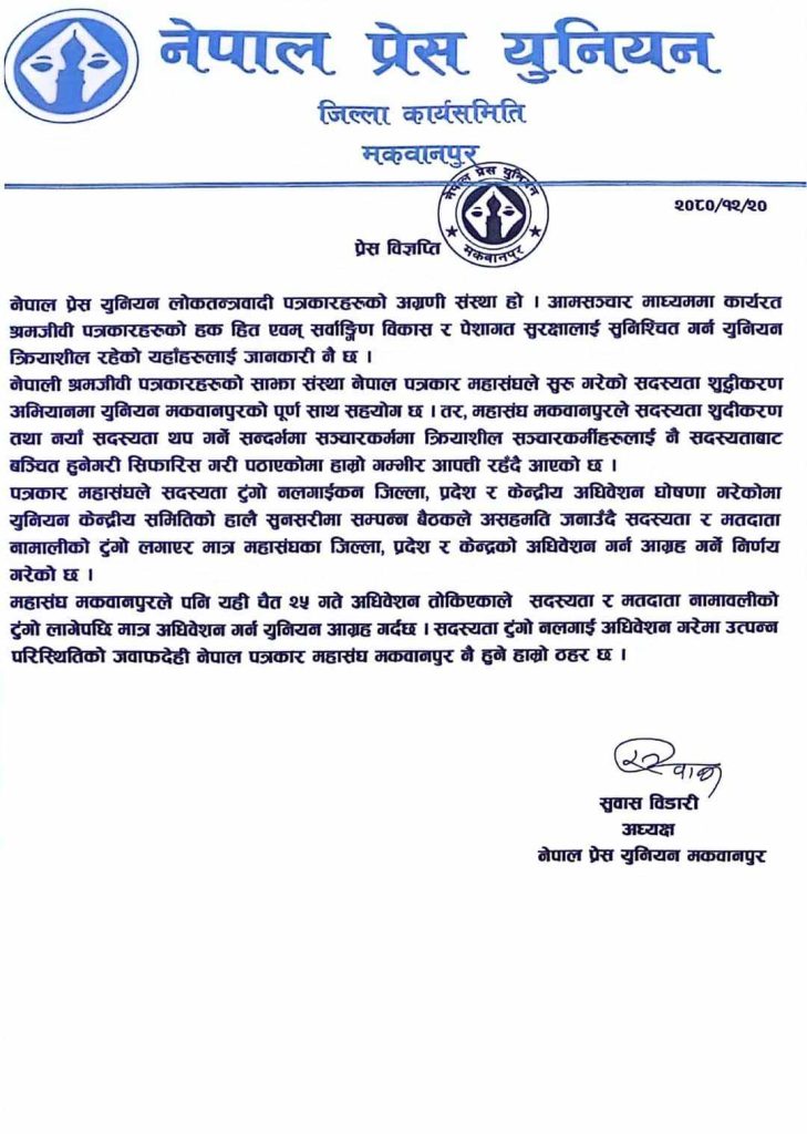 युनियन केन्द्रीय समितिको हालै सुनसरीमा सम्पन्न बैठकले महासंघको साधारणसभाको विषयमा असहमति जनाउँदै सदस्यता र मतदाता नामालीको टुंगो लगाएर मात्र महासंघका जिल्ला, प्रदेश र केन्द्रको अधिवेशन गर्न आग्रह गर्ने निर्णय गरेको थियो । ‘सदस्यता टुंगो नलगाई अधिवेशन गरेमा उत्पन्न परिस्थितिको जवाफदेही नेपाल पत्रकार महासंघ मकवानपुर नै हुने हाम्रो ठहर छ ।’, युनियनले बुझाएको विज्ञप्तिमा भनिएको छ ।