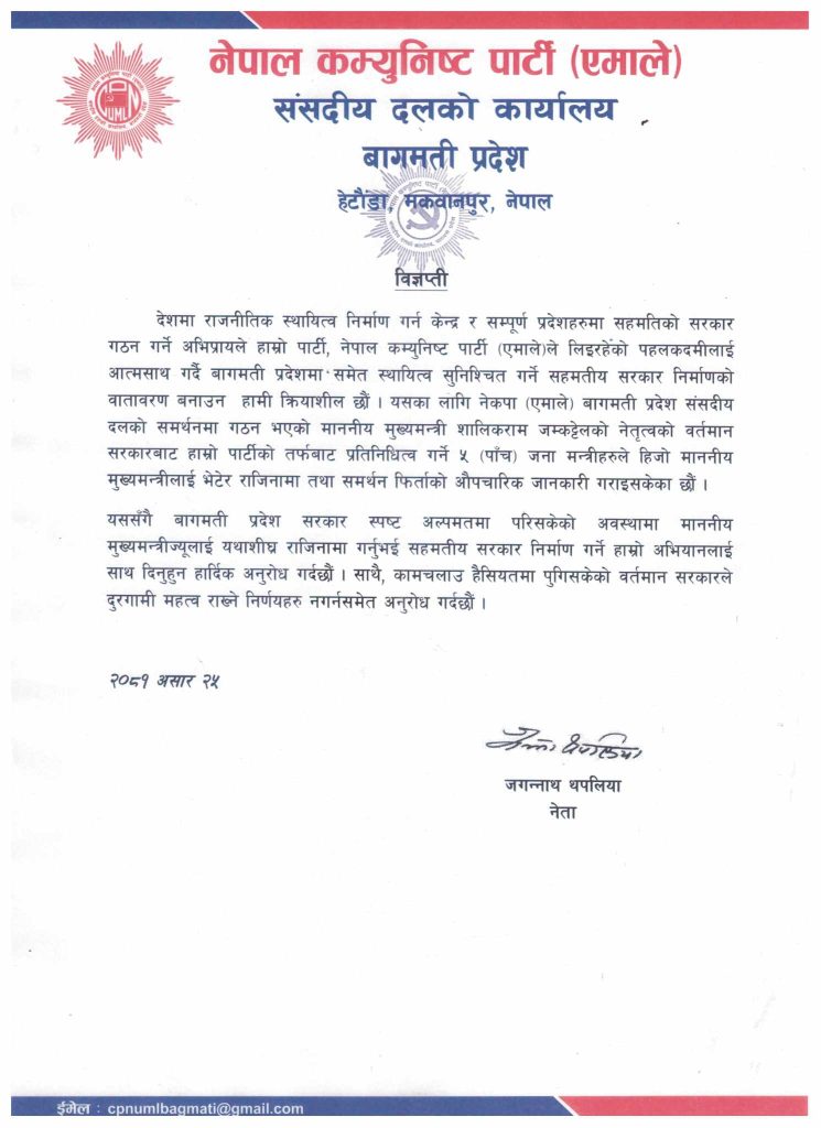 जारी बिज्ञप्तीमा भनिएको छ “देशमा राजनीतिक स्थायित्व निर्माण गर्न केन्द्र र सम्पूर्ण प्रदेशहरुमा सहमतिको सरकार गठन गर्ने अभिप्रायले हाम्रो पार्टी, नेपाल कम्युनिष्ट पार्टी (एमाले) ले लिइरहेको पहलकदमीलाई आत्मसाथ गर्दै बागमती प्रदेशमा समेत स्थायित्व सुनिश्चित गर्ने सहमतीय सरकार निर्माणको वातावरण बनाउन हामी क्रियाशील छौं। यसका लागि नेकपा (एमाले) बागमती प्रदेश संसदीय दलको समर्थनमा गठन भएको माननीय मुख्यमन्त्री शालिकराम जम्कट्टेलको नेतृत्वको वर्तमान सरकारबाट हाम्रो पार्टीको तर्फबाट प्रतिनिधित्व गर्ने ५ (पाँच) जना मन्त्रीहरुले हिजो माननीय मुख्यमन्त्रीलाई भेटेर राजिनामा तथा समर्थन फिर्ताको औपचारिक जानकारी गराइसकेका छौं ।”