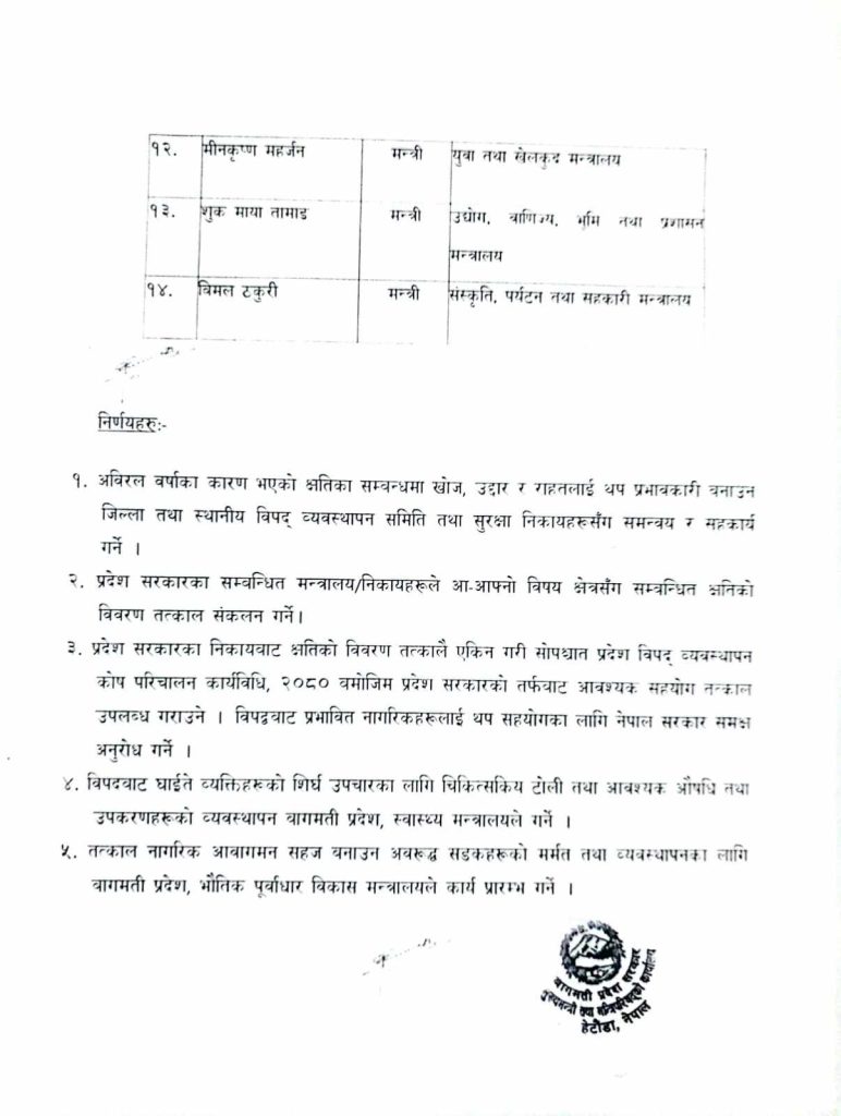 त्यस्तै, बैठकले विपद्बाट घाइते व्यक्तिहरूको सीघ्र उपचारका लागि चिकित्सकीय टोली तथा आवश्यक औषधि तथा उपकरणहरूको व्यवस्थापन प्रदेश स्वास्थ्य मन्त्रालयले गर्ने, तत्काल नागरिक आवागमन सहज बनाउन अवरूद्ध सडकहरूको मर्मत तथा व्यवस्थापनका लागि प्रदेशको भौतिक पूर्वाधार विकास मन्त्रालयले कार्य प्रारम्भ गर्ने निर्णय गरेको छ ।