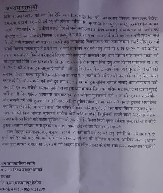 प्रहरीले अजिताले बोक्ने मोबाइलको माध्यमबाट घटनामा सम्लग्नलाई पक्राउ गर्न सकेको जनाएको छ । मृतक अजिताले बोक्ने मोबाइल हेटौंडा–११ बस्ने वर्ष २० एलिसा पाख्रिनसँग बरामद गरेपछि घटनाको रहस्य खुल्दै गएको प्रहरी उपरीक्षक कार्कीले जानकारी दिनुभयो । पाख्रिनको माध्यमबाट अन्य चार जनालाई प्रहरीले पक्राउ गरेको जनाएको छ । घटनाको अनुसन्धान जिल्ला प्रहरी कार्यालय मकवानपुर र अपराध महाशाखा टेकुको प्रहरी टोली खटिएको थियो । हत्यामा सम्लग्न भएको भन्दै प्रहरीले हेटौंडा–११ बस्ने वर्ष २० एलिसा पाख्रिन, हेटौंडा–४ बस्ने वर्ष २४ को आशिष बल, हेटौंडा–१४ बस्ने वर्ष २१ बुद्ध लामा, हेटौंडा–९ बस्ने वर्ष १८ को सिमोन परियार र हेटौंडा–४ बस्ने वर्ष २५ को शुसिल थापा मगरलाई पत्रकार सम्मेलन मार्फत सार्वजनीक गरेको छ । उनिहरुले थानाभ¥याङमा ना ६ ख ६५२७ नम्बरको ट्रक भित्र भुजेलको हत्यार गरेर क्याम्पाडाँडामा लगेर फालेको अनुसन्धानबाट खुलेको प्रहरी नायव उपरीक्षक टिकाबहादुर कार्कीले जानकारी दिनुभयो । घटनाको विषयमा थप अनुसन्धान भइरहेको समेत उहाँले बताउनुभयो ।