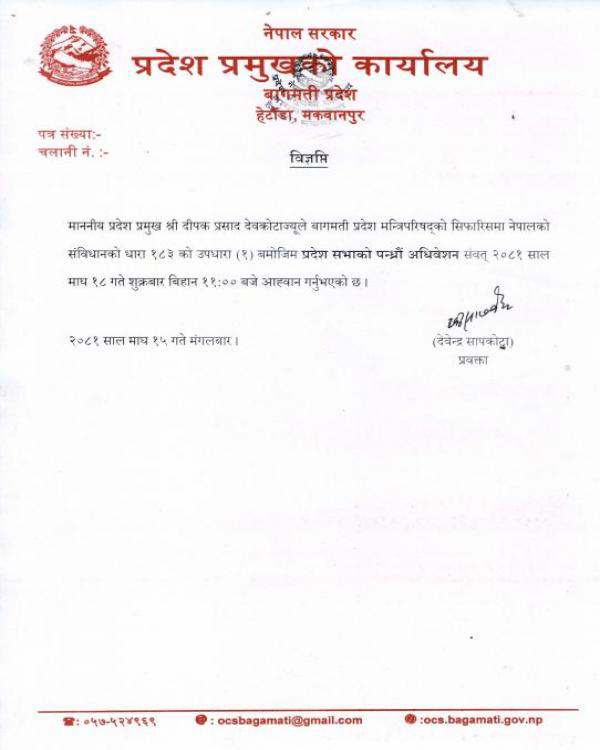 बागमती प्रदेश मुख्यमन्त्री तथा मन्त्रिपरिषद्को गत शुक्रबार बसेको मन्त्रिपरिषद्को बैठकले संसद् अधिवेशन आह्वानका लागि प्रदेश प्रमुख समक्ष सिफारिस गरेको थियो । सोहीअनुसार प्रदेश प्रमुख देवकोटाले नेपालको संविधानको धारा १८३ को उपधारा १ को अधिकार प्रयोग गरी प्रदेशसभाको बैठक अधिवेशन आह्वान गरेको प्रदेश प्रमुख सचिवालयले जनाएको छ ।