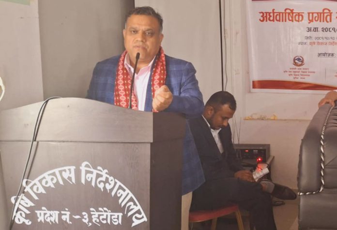 मकवानपुरगढी, चैत १३ गते। बागमती प्रदेशका कृषिमन्त्री प्रकाश श्रेष्ठले कृषि क्षेत्रको समग्र विकास उपलब्धिमूलक नरहेको बताउनुभएको छ । बुधबार कृषि विकास निर्देशनालय हेटौंडामा आयोजित अर्धवार्षिक समीक्षा गोष्ठी कार्यक्रममा उहाँले यस्तो बताउनु भएको हो ।