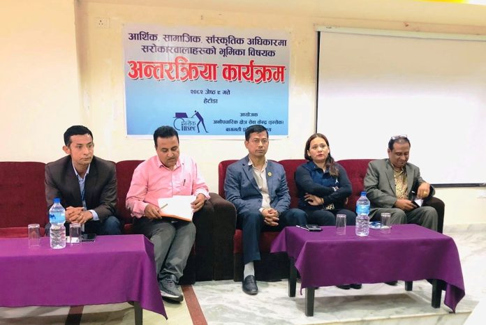 शुक्रबार अनौपचारिक क्षेत्र सेवा केन्द्र (इन्सेक) बागमती प्रदेश कार्यालयले हेटौंडामा “आर्थिक, सामाजिक तथा सांस्कृतिक अधिकारमा सरोकारवालाको भूमिका“ विषयक अन्तरक्रिया कार्यक्रम आयोजना गरेको थियो । कार्यक्रममा सहभागि सरोकारवालाहरुले मानव अधिकारको संरक्षण र प्रवद्र्धनका लागि आर्थिक, सामाजिक तथा सांस्कृतिक अधिकार स्थापित हुनु पर्ने धारणा राखेका थिए । जसका लागि सरकारी निकाय, नागरिक समाज, सुरक्षा निकाय, सञ्चार माध्यम र स्थानीयसमुदायबीच सहकार्य र समन्वय अपरिहार्य रहेको उनिहरुले बताएका छन् ।