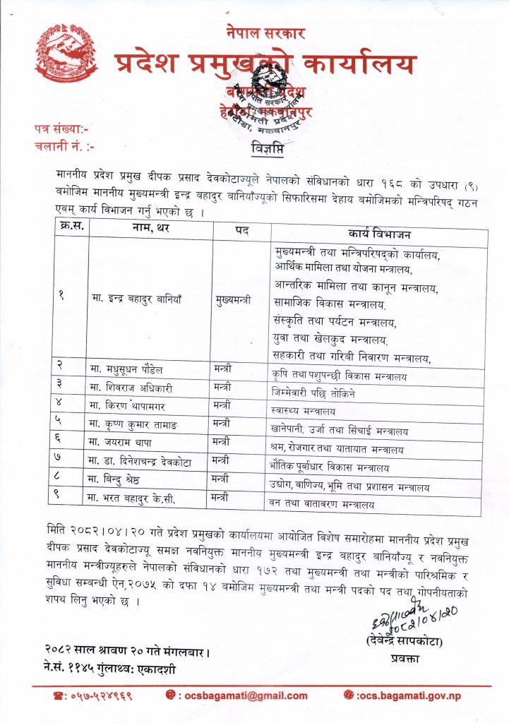 मुख्यमन्त्री बानियाँले एमालेबाट मधुसुदन पौडेललाई कृषि तथा पशुपंछी विकास मन्त्री, डा. दिनेशचन्द्र देवकोटालाई भौतिक पूर्वाधार विकासमन्त्री, जयराम थापालाई श्रम रोजगार तथा यातायात मन्त्री, भरतबहादुर केसीलाई वन तथा वातावरणमन्त्री, किरण थापालाई स्वास्थ्य मन्त्री र बिन्दु श्रेष्ठलाई उद्योग वाणिज्य भूमि तथा प्रशासन मन्त्री नियुक्त गर्नुभएको थियो । भने, कांग्रेसबाट खानेपानी ऊर्जा तथा सिँचाई मन्त्रालयमा कृष्णकुमार तामाङ र शिवराज अधिकारीलाई बिना विभागीय मन्त्री नियुक्त गर्नु भएको थियो । कांग्रेसको भागमा परेको प्रदेशका मुख्यमन्त्रीसहित ८ मन्त्रालयमा दुई मन्त्री नियुक्त गरी अन्य ५ मन्त्रालय भने मुख्यमन्त्री बानियाँले आफैं मातहत राख्नुभएको छ । बागमती प्रदेशमा कुल १४ मध्ये कांग्रेसको भागमा मुख्यमन्त्रीसहित ८ र एमालेको भागमा ६ मन्त्रालय छ ।