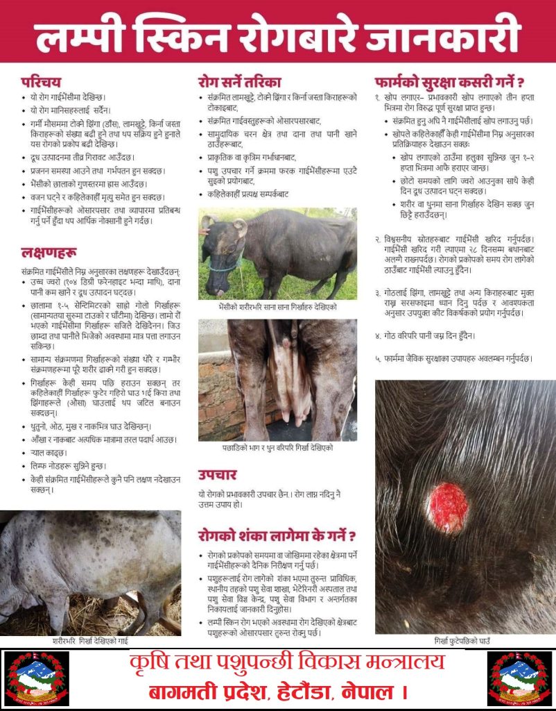 असार–साउनमा मात्रै प्रदेशमा ७४ गाई–भैंसीको मृत्यु र १ हजार ६३३ मा सङ्क्रमण पुष्टि भएको उहाँले बताउनुभयो । मकवानपुर, सिन्धुली, काभ्रे र सिन्धुपाल्चोकमा बढी प्रकोप देखिएको बताउनु हुँदै उहाँले लम्पी स्किन रोगले दूध उत्पादन २५ देखि ८० प्रतिशतसम्म घटाउने, उच्च ज्वरो, गाँठा, सुन्निने र हिँड्न गाह्रो हुने लक्षण देखिने जानकारी दिनुभयो ।