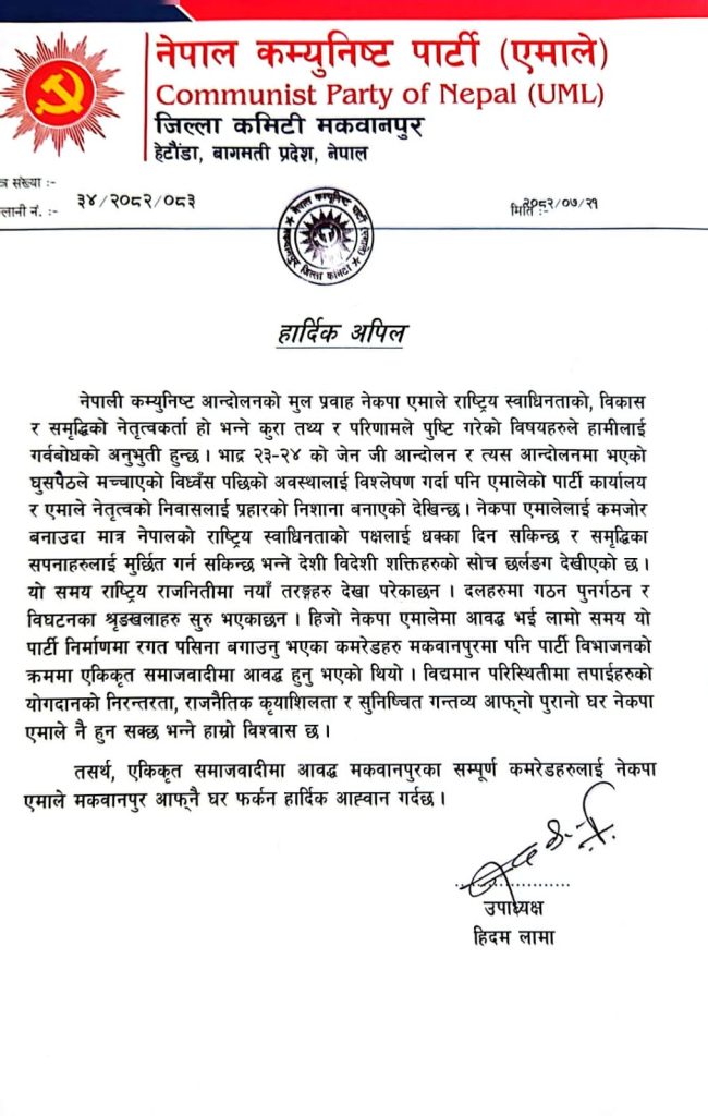 अपिलमा भनिएको छ, “जेठ २३–२४ को राजनीतिक आन्दोलनपछि पनि पार्टी कार्यालयहरूलाई आक्रमणको लक्ष्य बनाइनु, एमालेको स्थायित्व र राष्ट्रिय स्वाभिमानमाथि प्रहार हो ।” उपाध्यक्ष लामाले विदेशी स्वार्थ समूहहरूले नेपालको स्वाधीनता कमजोर पार्ने प्रयास गरिरहेका बेला सबै देशभक्त र क्रान्तिकारी शक्तिहरू एमालेको झण्डा मुनि एकजुट हुनुपर्ने आवश्यकता औँल्याउनु भएको छन् । उहाँले राजनीतिक निरन्तरता, कार्यदक्षता र संगठनात्मक सबलीकरणका लागि पुरानो घर नेकपा (एमाले) मै फर्कनु आजको आवश्यकता भएको भन्दै पार्टीका तर्फबाट जिल्लाका सबै कमरेडहरूलाई एकता, अनुशासन र समाजवादी आन्दोलनको बलियो आधार निर्माण गर्न अपिल गर्नु भएको छ ।