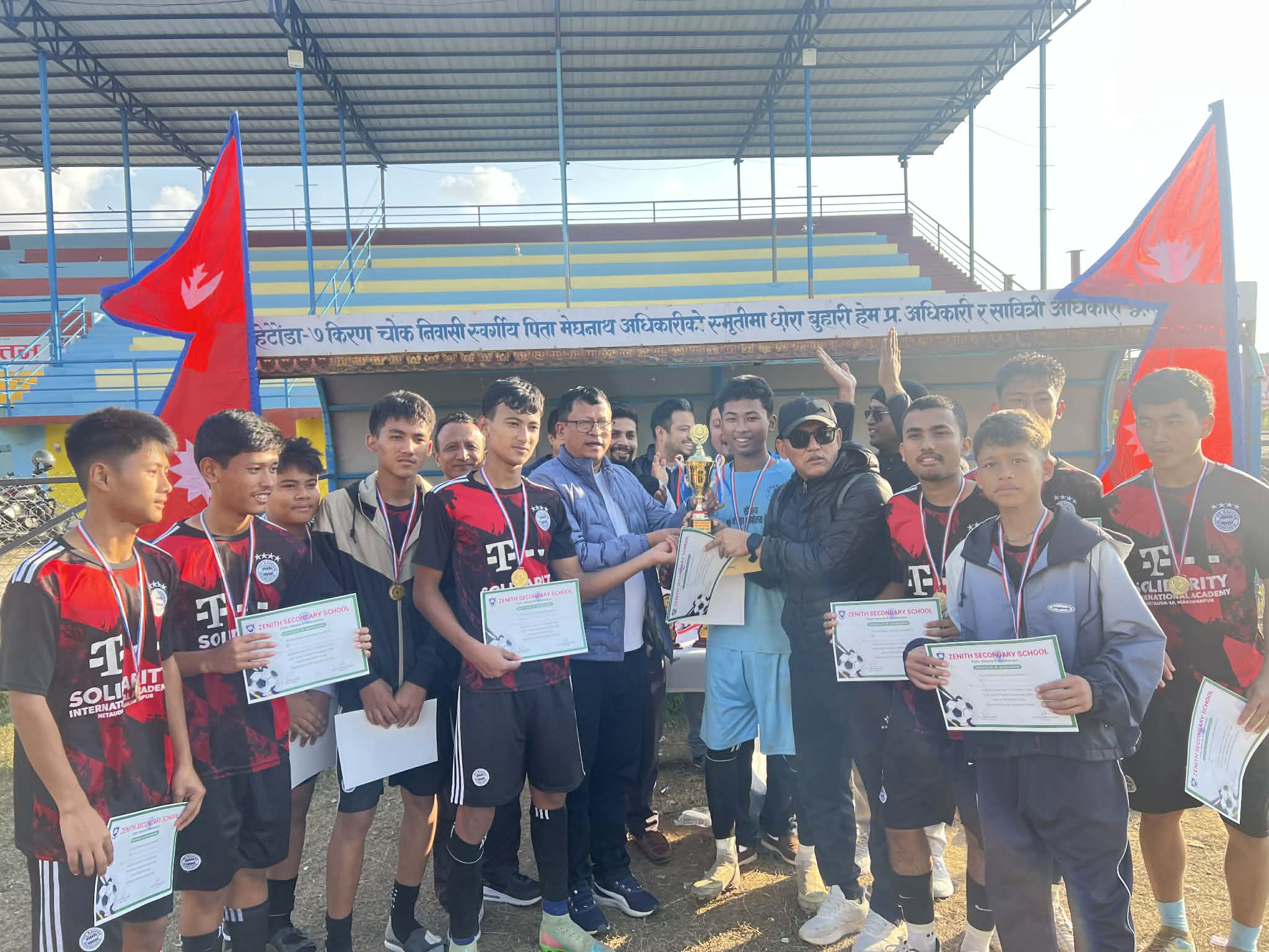 हेटौंडा । हेटौँडा–५ स्थित जेनिथ माध्यमिक विद्यालयको आयोजना शुक्रबार भएको अन्तर विद्यालय फुटबल प्रतियोगिताको उपाधी सोलिड्यारिटी इन्टरनेशनल विद्यालयले हात पारेको छ । हेटौँडा उपमहानगरपालिकाभित्रका १० वटा संस्थागत विद्यालयको सहभागिता रहेको प्रतियोगिताको फाइनल खेलमा सत्यम जेभियर्स माध्यमिक विद्यालयलाई ३–१ गोल अन्तरले पराजित गर्दै सोलिड्यारिटी च्याम्पियन बनेको हो ।