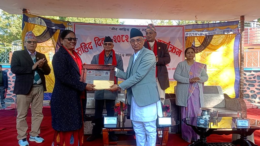 गत माघ १० गते देखि सप्ताहव्यापी रुपमा मनाईएको सहिद सप्ताहको आज अन्तिम दिन माघ १६ गते विविध कार्यक्रम आयोजना गरेर समापन गरिएको हो । दिवशका अवसरमा आज मुख्य दिन सहिदहरु प्रति सलामी, माल्यार्पण, श्रद्धाञ्जली सभा, श्रीचन्द्र शर्मा स्मृति सम्मान पुरस्कार वितरण र समापन कार्यक्रम कार्यक्रम भएको स्मारक विकास समितिका सचिव रघुनाथ खुलालले बताउनुभयो ।