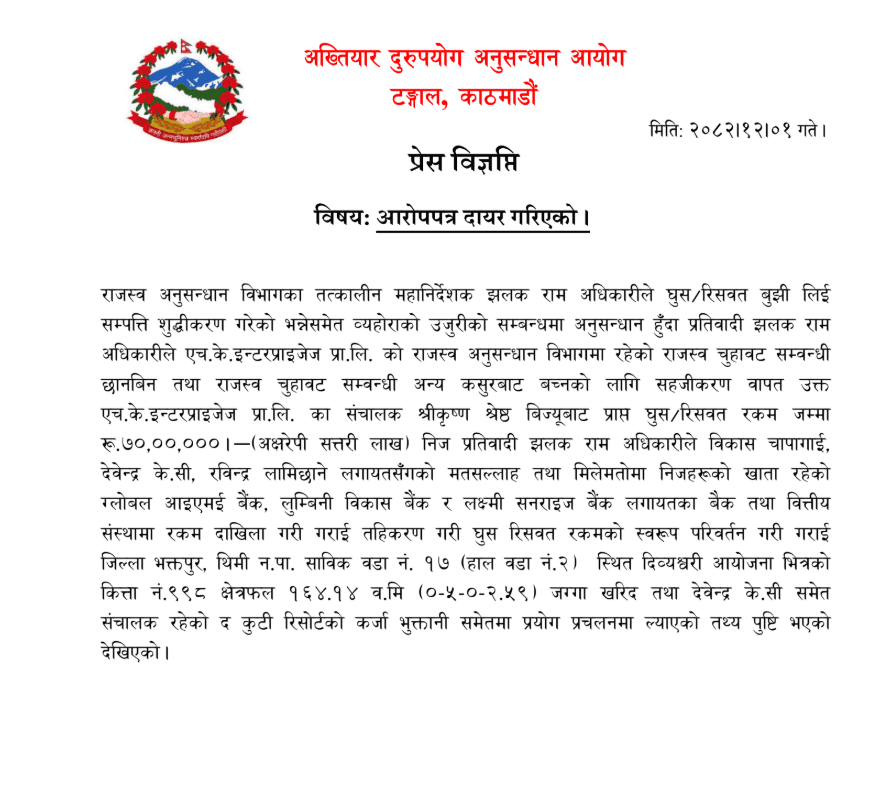 हेटौँडा, चैत १ । अख्तियार दुरूपयोग अनुसन्धान आयोगले राजस्व अनुसन्धान विभागका तत्कालीन महानिर्देशक झलकराम अधिकारीविरूद्ध भ्रष्टाचार मुद्दा दायर गरेको छ । ७० लाख रूपैयाँ घुस लिएको पाइएपछि विशेष अदालतमा भ्रष्टाचार मुद्दा दायर गरेको अख्तियारका प्रवक्ता सुरेश न्यौपानेले जानकारी दिनुभयो ।