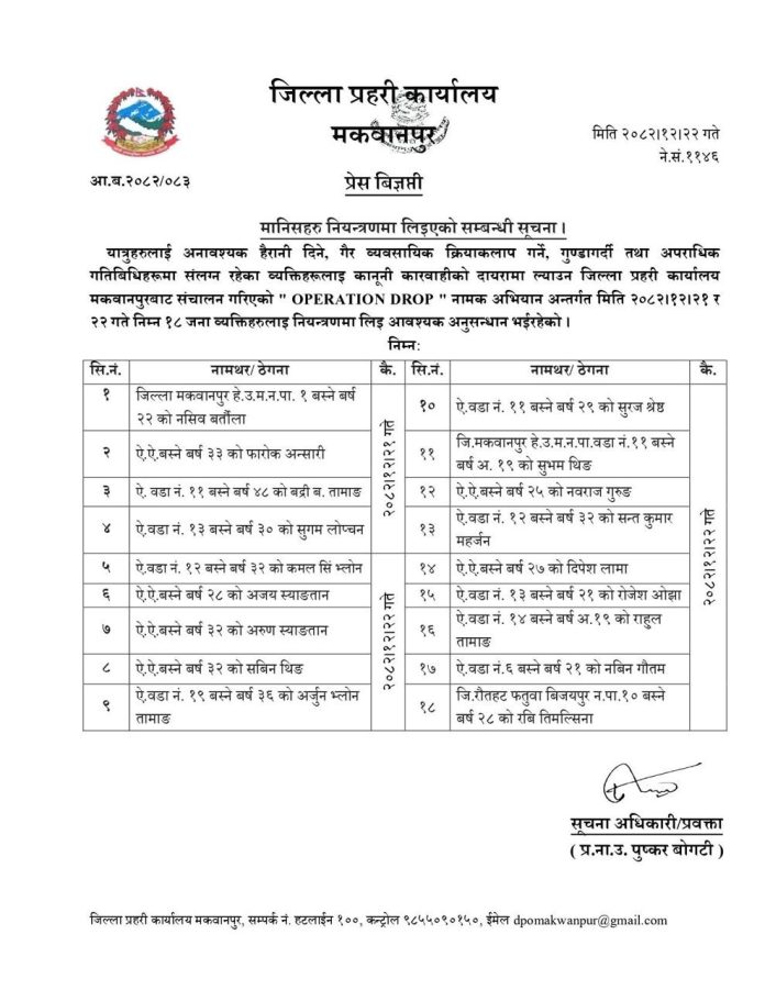 मकवानपुर, चैत्र २२ । मकवानपुर प्रहरीले विभिन्न आपराधिक गतिविधिमा संलग्न रहेको आरोपमा १८ जनालाई नियन्त्रणमा लिएको छ । प्रहरीले सञ्चालन गरेको ‘अपरेशन ड्रप’ अभियानअन्तर्गत गुण्डागर्दी, अवाञ्छित गतिविधि तथा सर्वसाधारणलाई दुःख दिने १८ जनालाई हेटौंडाका विभिन्न वडाबाट नियन्त्रणमा लिइएको हो ।